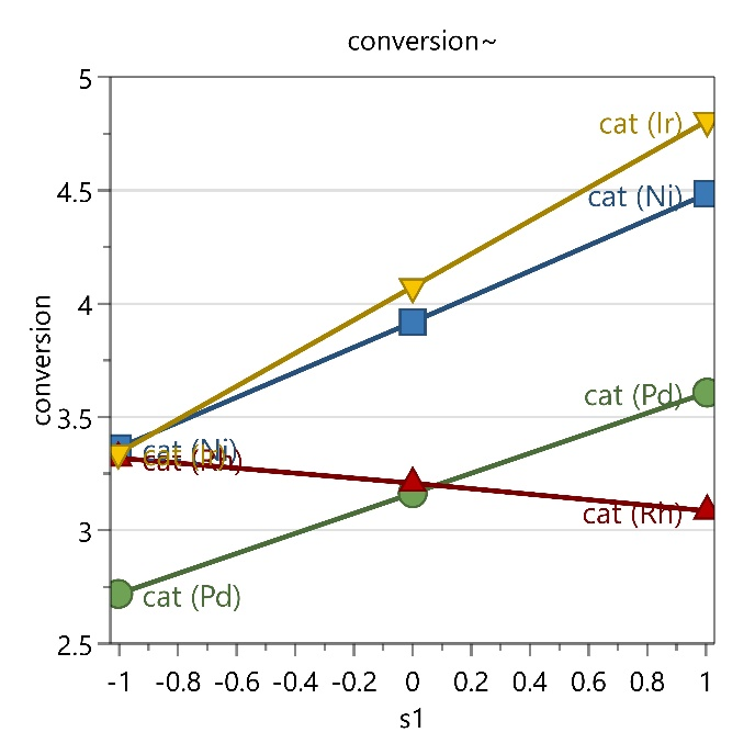 Both Rh and Pd catalysts achieved 100% conversion, with every ligand working in combination with Pd when toluene was the solvent. Analysis of the data showed that the ligands with Pd had no significance on conversion but the solvents played a big role, as seen by the interaction plots below, with less polar solvents achieving greater conversion.